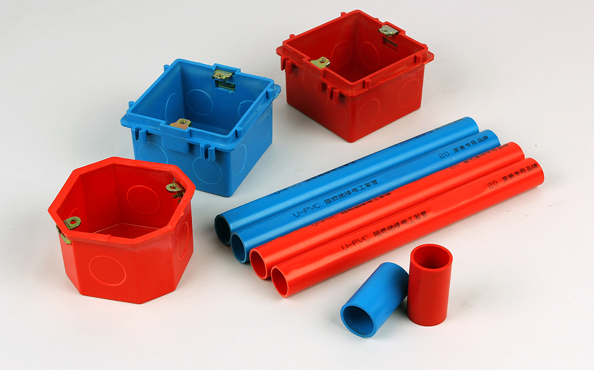 1. 以聚氯乙烯樹脂為主要原料,添加特殊助劑,經(jīng)擠出和注塑加工而成的導(dǎo)線管材及管件,顏色一般為白色、紅色、藍(lán)色。